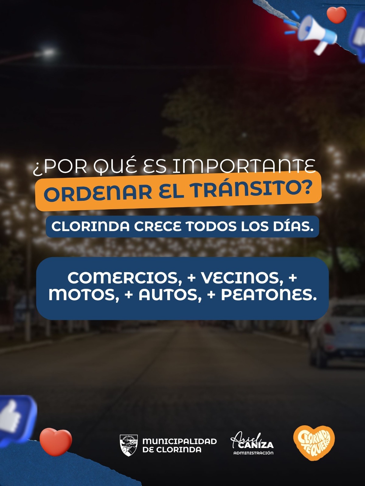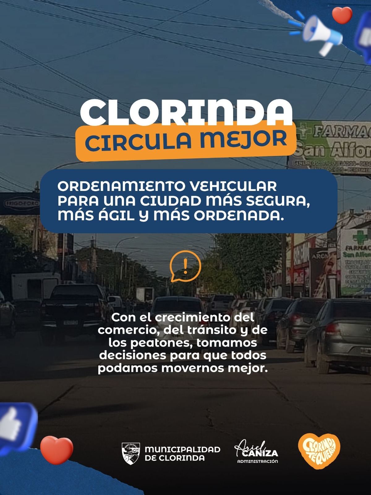 Clorinda crece todos los días, sumando más comercios, vecinos, vehículos y peatones. Ese aumento en la actividad diaria hace necesario un ordenamiento vehicular que garantice una ciudad más segura, dinámica y organizada. Con el crecimiento del comercio y del tránsito, el municipio toma decisiones que buscan mejorar la circulación, reducir riesgos y lograr que todos podamos movernos mejor, ya sea en auto, moto, bici o a pie.