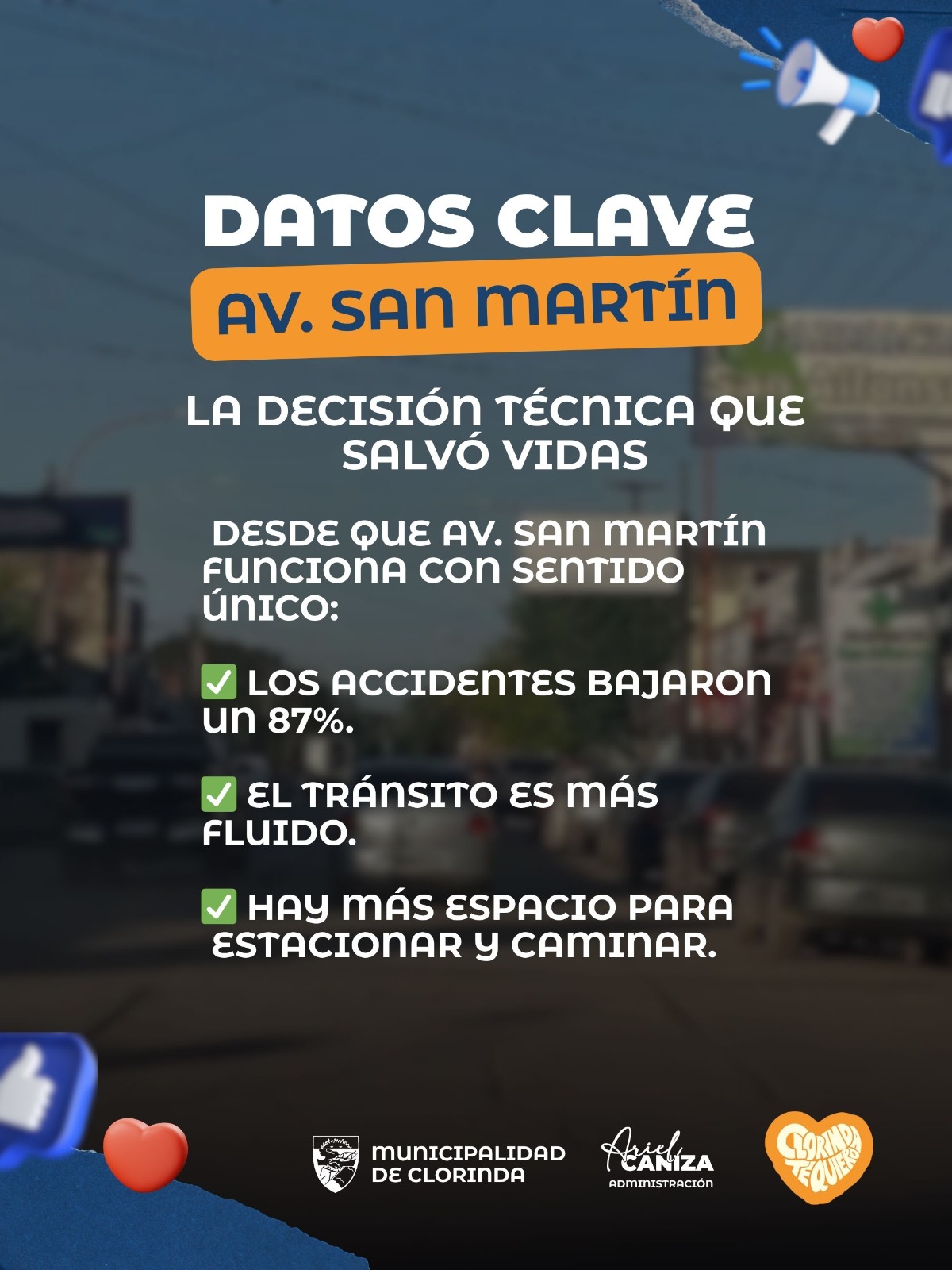 La decisión de implementar el sentido único en la avenida San Martín marcó un antes y un después en la seguridad vial de la ciudad. Desde que la medida entró en vigencia, los accidentes se redujeron un 87%, el tránsito es más ágil y ordenado, y ahora hay más espacio para estacionar y caminar.