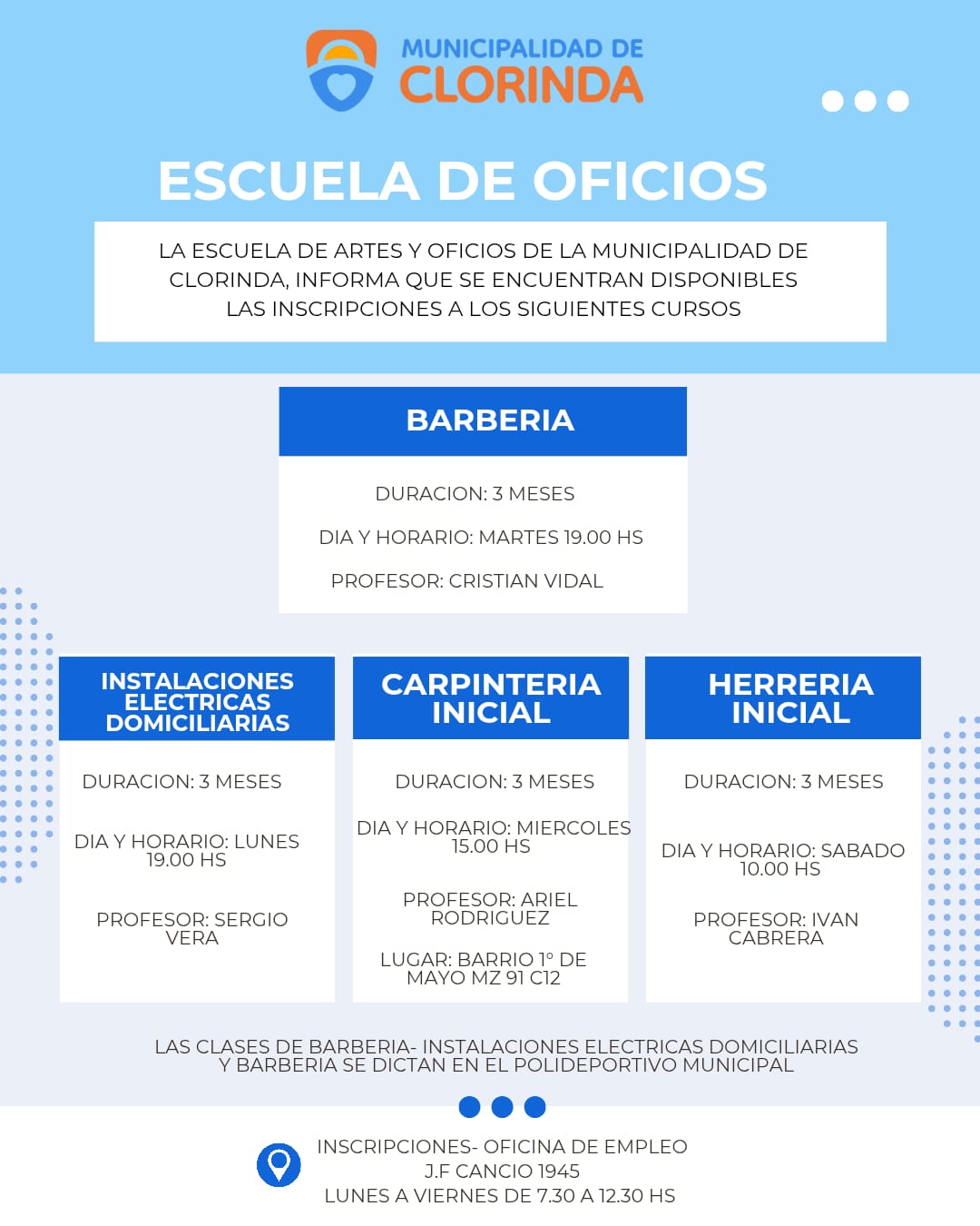 La Oficina de Empleo de Clorinda, dependiente de la Municipalidad, anunció la apertura de inscripciones para los nuevos cursos de la Escuela de Artes y Oficios, una iniciativa que continúa brindando oportunidades de capacitación gratuita para los vecinos de la ciudad.