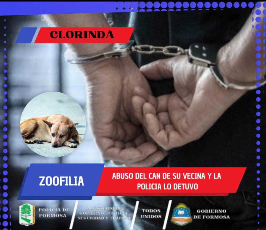 En la Villa San Miguel de Clorinda, la policía detuvo a un hombre mayor acusado de abusar sexualmente de un perro. El hecho fue denunciado por una vecina y confirmado por un veterinario; el imputado quedó detenido por infracción a la Ley de Protección Animal.